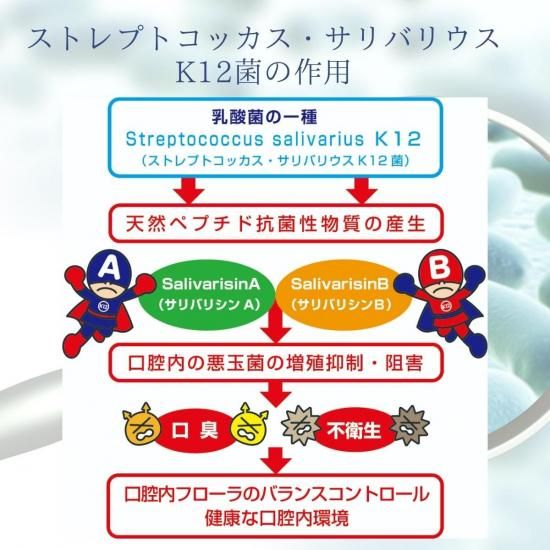 そこでおすすめしたいのが、お口の善玉菌を補給する「口腔内プロバイオティクス」という新発想のオーラルケア。この製品は、世界中の研究者が注目する善玉菌「Streptococcus salivarius K12(唾液連鎖球菌)」を配合しています。
