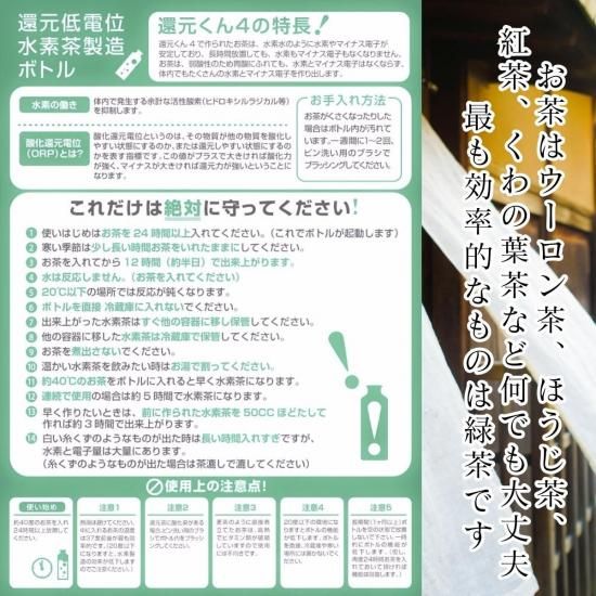 還元くん4は革新的な低電位水素茶製造ボトルです。お茶の抗酸化力を最大限に引き出し、水素茶を手軽に製造できる「魔法瓶」ボトルです。特許商品であり、従来の還元水や水素水とは異なる電解水方式を採用しています。