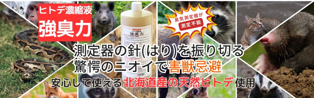 強臭力は驚愕のニオイで臭気測定器の限界を突破するほどのニオイです。特殊な製造方法により海からあがったヒトデを液体抽出して濃縮させています。その脅威のニオイは餌場に集まったシカも飛び跳ねて逃げるほどです。 動物の嗅覚は人間の何倍もあり、あえて危険なニオイの発する場所にはいかず他の場所を選択するため、忌避するという仕組みとなります。