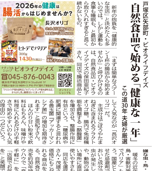 タウンニュース様の記事第二弾のご紹介です。2026年元旦に掲載されますので、新年早々ですがぜひ当店の記事をお探しください。当店大人気の腸活「長沢オリゴ」とヒトデ忌避材「ヒトデでバリア」をご紹介しております。いち早く本ブログにて完成記事をご紹介いたします。